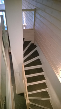 Porrastakka-leivinuuni. Uunien päälle on muurattu yläkertaan johtava portaikko. Takan luukku on seinän toisella puolella, Luhanka 2012.