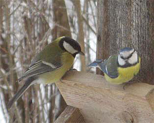 Ikkunamme alla vierailevista talvilinnuista näet tässä harmaapäätikan, urpiaiskoiraan puolustamassa paikkaansa sinitiaiselta, pyrstötiaisen, käpytikan, kaksi urpiaista sulassa sovussa, talitiaisen sinitiaisen kaverina, maassa nokkivan keltasirkun, pikkutikan talipallolla ja viherpeipon. Päivittäin ruokintapaikalla saattaa nähdä kymmenittäin lintuja yhtä aikaa. Ahkerimpia ovat sinitiaiset. Ne ovat myös sosiaalisia kuten niitä aremmat pyrstötiaiset. Viherpeippo puollustaa ruokailuoikeuttaan, mutta sitä reilusti pienempi urpiainen ajaa senkin tiehensä. Harvinaisin vierailija on muutaman kerran käynyt harmaapäätikka. Valokuvaaja on bongannut lisäksi ainakin punatulkun, hömötiaisen, varpusen, tilhen, närhen ja harakan.